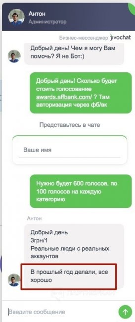 А вот и свежая переписка с одним таким сервисом накрутки. Просим обратить внимание на масштабы трагедии — “Там цифра за 5к голосов превышает”.