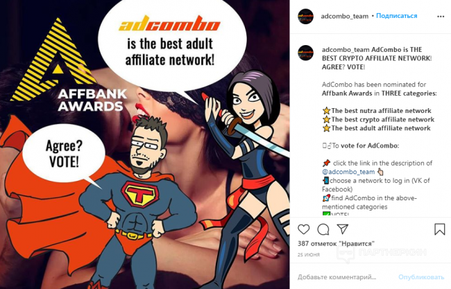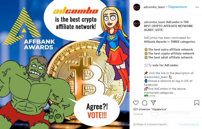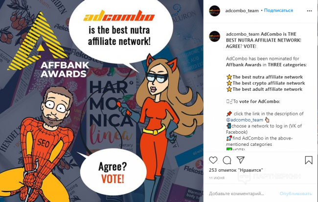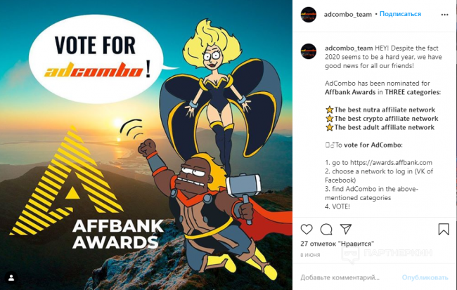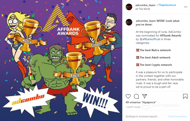 Было бы грехом не начать с самих AdCombo, тем более, что они победили сразу в трех номинациях. Итак, что же мы видим, кроме супергеройского арта? Ну, например, прирост лайков в геометрической прогрессии, особенно после выхода той самой разоблачающей статьи.