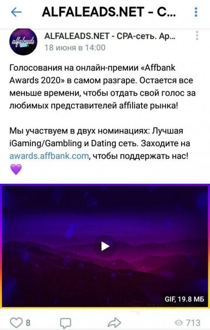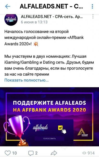 Что касается Alfaleads, то они довольно активно промоутили голосование. Лайки здесь никто не накручивал, и, судя по охватам, все может быть.