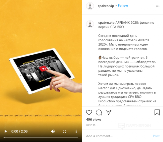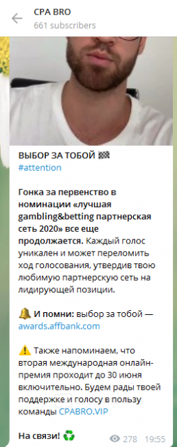 Только одно здесь смущает — время публикации видео. Почему оно было не в начале голосования? Такой контент делается не за пару часов, в перерыве между текучкой. И запускать его в последний момент, тягаясь с довольно серьезными конкурентами — затея довольно рискованная. Конечно, кто не рискует, тот не берет кубок Affbank Awards, но возможно ли то, что они заранее знали исход… Так много вопросов и так мало ответов.