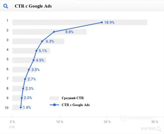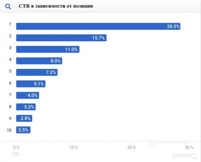 Исследование показало, что средний CTR резко падает после первой позиции — вторая и третья позиции имеют CTR 15% и 11% соответственно. Третья позиция будет генерировать в среднем в 3 раза больше кликов, чем шестая позиция.