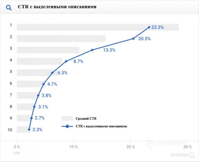 Фактически, результаты на второй и третьей позиции получают больше трафика, если первая позиция показывается с выделенными описаниями.