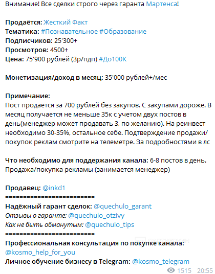 В сети наблюдается огромное количество предложений по продаже каналов в Телеграме, готовых к работе: с подписчиками, советами по монетизации и прочими плюшками. Продавцы сулят золотые горы, обещая, что рекламодатели будут стоять в очереди и записываться на промо-пост за два дня вперед.
