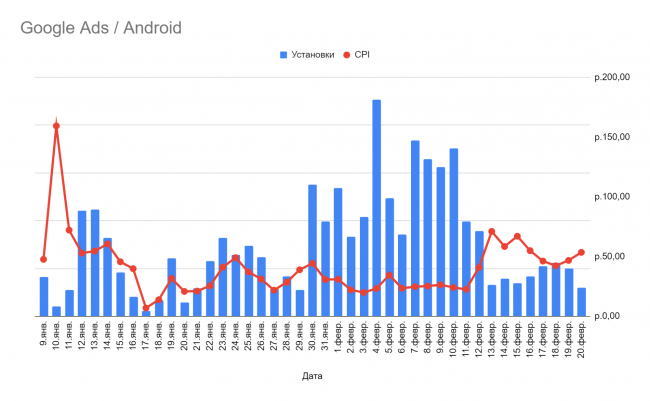 В Google Ads мы получили 60% установок приложения по цене, равной примерно 52 рублям. Из них 68% установок Android приложения и 32% — iOS приложения.