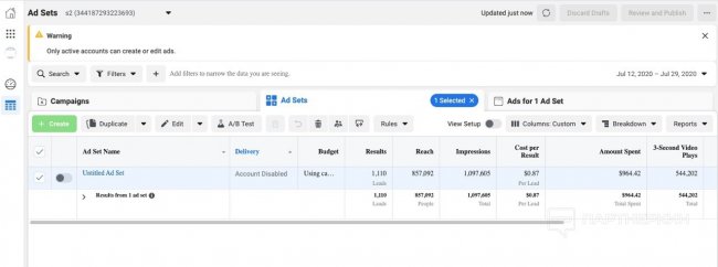 Из сложностей во время открута было только, что ФП 2 раза банилась (ФП забирал с др соца) и открут рекламы останавливался. Но я все контролил. Быстро создавал новый ФП, редактировал объявление с заменой страницы и публиковал. Модерация, когда заменяется только ФП проходит очень быстро и открут возобновляется почти сразу.
