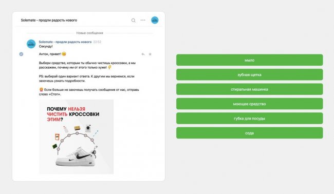 На этом этапе 85% выбирают чистящее средство и жмут на кнопку. Через минуту от чат-бота приходит сообщение с предложением получить персонализированное видео по чистке кроссовок — перед этим бот спрашивает у подписчика, из какого материала сделана его обувь и какого цвета подошва, чтобы отправить правильное видео. На вопросы отвечают 62% подписчиков, и дальше чат-бот предлагает промокод на скидку и отправляет персонализированное видео.