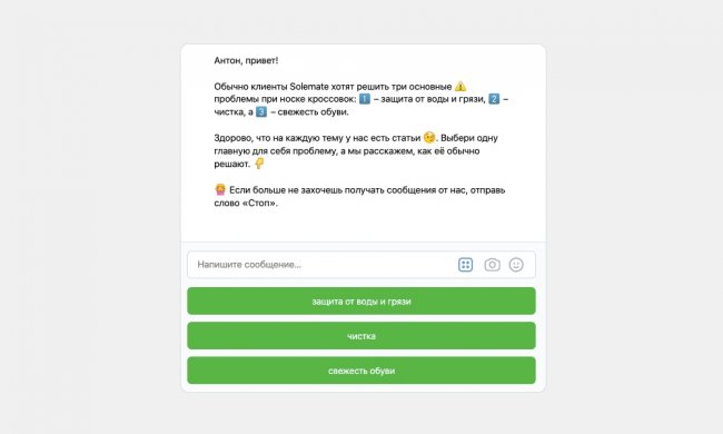 Подробнее о чат-боте. После клика по рекламному объявлению пользователь попадает на внутренний лендинг ВКонтакте, где бренд предлагает чек-лист по чистке кроссовок в личные сообщения. После того, как юзер нажал на кнопку «Получить» на лендинге, он автоматически становится подписчиком рассылки, и ему приходит стартовое сообщение от чат-бота. В нем мы предлагаем выбрать средство, которым человек обычно чистит кроссовки. Вот как это выглядит: