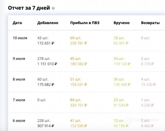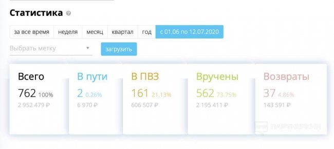 Здесь видно что основная часть уже выкуплена, в ПВЗ ожидают своих клиентов 161 заказ на общую сумму 606.507 рубля