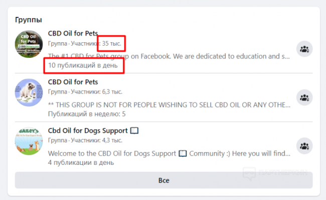 Дальше направляем свой взор на всеми любимые социальные сети. И опять же, далеко не заходя, при вводе самого банального запроса мы видим что fb встречает нас выборкой ресурсов с довольно активными участниками: