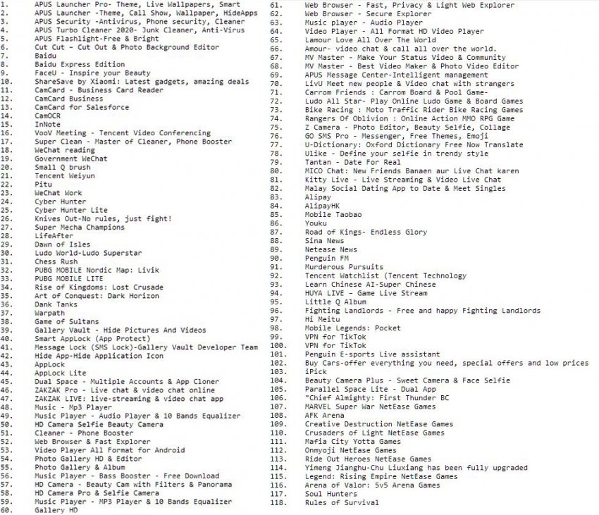 В новый список заблокированных приложений вошли такие популярные продукты, как WeChat, AliPay, PUBG и Baidu (полный список можно увидеть ниже). Так, только у китайского гиганта Tencent под блокировку попал ряд собственных приложений (помимо WeChat и PUBG, в которых компания имеет долю), включая инструмент для видеоконференцсвязи VooV, службу хранения Weiyun и Watchlist. Интересно, что бан касается как приложений для Android, так и для iOS.