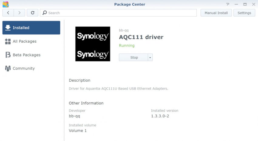 Пробуем подключить пятигигабитный адаптер от основного конкурента Synology — компании QNAP. Просто взять и подключить адаптер, разумеется, недостаточно: DSM корректно определит устройство, но без драйвера для AQC111U не увидит сетевого линка. На помощь приходит GitHub: драйверы для чипсета AQC111U в формате пакета для DSM можно скачать отсюда.