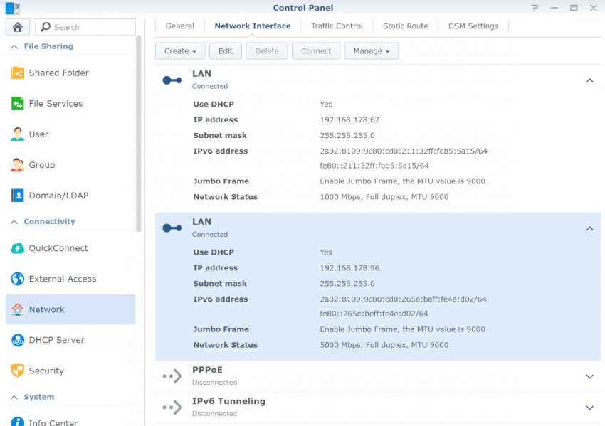 Если все сделано правильно, мы получим удвоенную скорость передачи данных между NAS и… собственно, между NAS и любым другим устройством, которое либо также использует агрегацию Round Robin (проверено на двух экземплярах Synology, подключенных к одному гигабитному коммутатору), либо подключено к тому же коммутатору по скоростному каналу на 2,5, 5 или 10 Гбит/с (проверено с собственным компьютером).