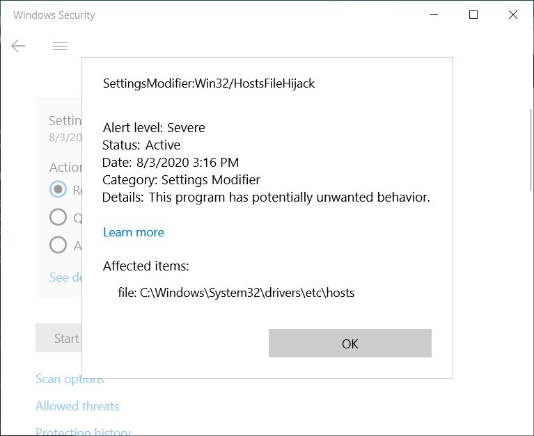 C:Windowssystem32driveretchosts) опасным, если в нем прописаны настройки, блокирующие сбор телеметрии.По информации издания, с конца июля измененный файл hosts определяется как представляющий угрозу «SettingsModifier: Win32/HostsFileHijack». Если, получив такое предупреждение, пользователь нажимает «Подробнее», ему не объясняют ничего, лишь сообщают, что файл демонстрирует «потенциально нежелательное поведение».