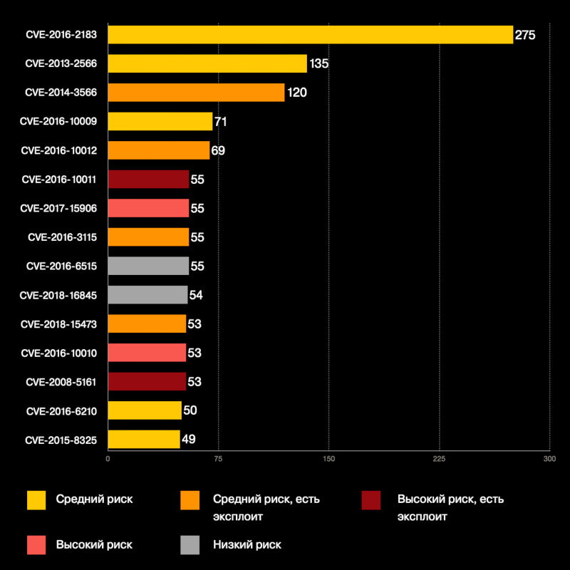 - В 84% организаций были выявлены уязвимости высокого уровня риска, причем в 58% компаний обнаружился хотя бы один узел с уязвимостью высокого уровня риска, для которой существует общедоступный эксплоит.