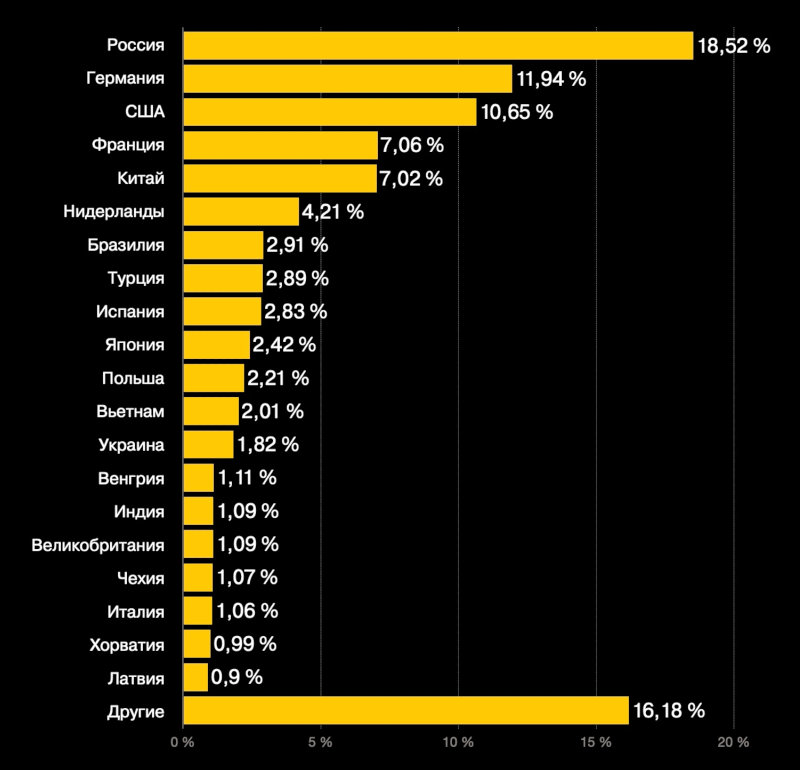 Доля спама в мировом почтовом трафике- Первые пять мест среди стран, лидирующих по количеству исходящего спама, разделили те же участники, что и в первом квартале 2020 года. Впереди всех, как и ранее, Россия (18,52%), а на втором месте Германия (11,94%), которая сместила США (10,65%) со второй на третью позицию. Четвертое и пятое места, как и в прошлом отчетном периоде, занимают Франция (7,06%) и Китай (7,02%).