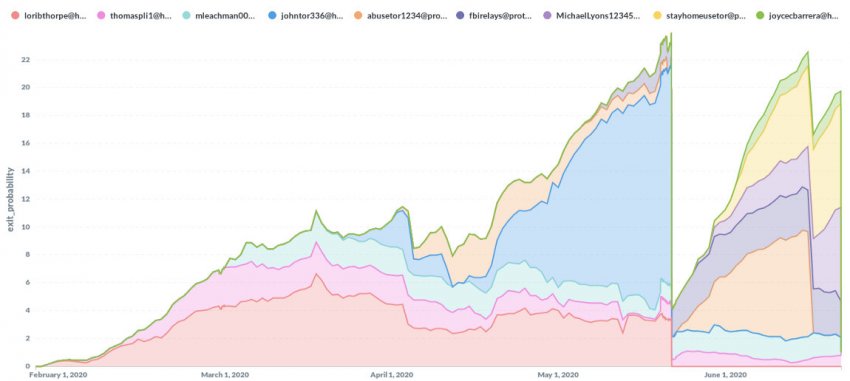 Сами по себе подобные атаки нельзя назвать новыми, но исследователь отмечает невиданный масштаб операции. Так, опираясь на контактный email-адрес вредоносных серверов, эксперт отследил по меньшей мере девять кластеров входных узлов, добавленных за последние семь месяцев. Вредоносная сеть достигла своего пика 22 мая текущего года, когда в нее входили 380 серверов и группировка контролировала 23,95% всех выходных узлов Tor.