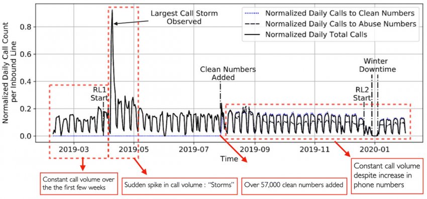 Для этого исследования ученые создали огромный телефонный honeypot и в течение одиннадцати месяцев (с марта 2019 года по январь 2020 года) управляли 66 606 телефонными линиями. В итоге суммарно за это время они получили 1 481 201 непрошеный роботизированный звонок, но номера honeypot-телефонов никогда не попадали в открытый доступ.