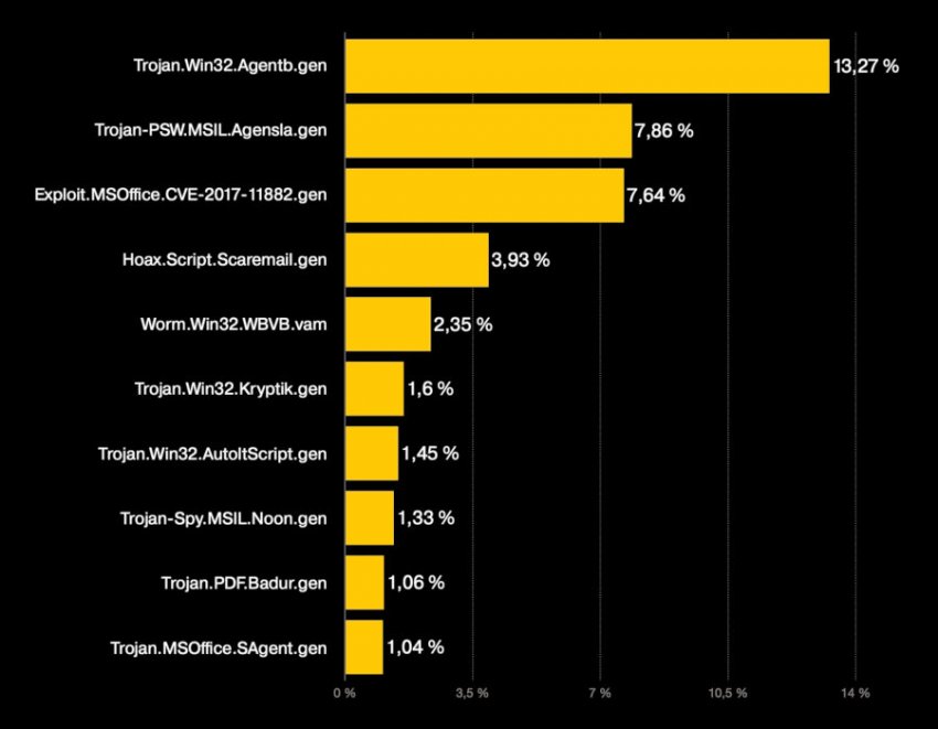 - Компания обнаружила 43 028 445 вредоносных почтовых вложений, что на 6 500 000 больше показателя прошлого отчетного периода.