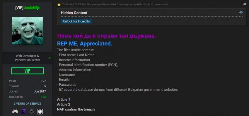 Напомню, что Instakilla активен примерно с 2017 года, хотя широкую известность он получил лишь в прошлом году. Так, летом 2019 года именно Instakilla слил в сеть информацию, похищенную у Национального налогового управления Болгарии, хотя он и не принимал непосредственного участия в самом взломе.
