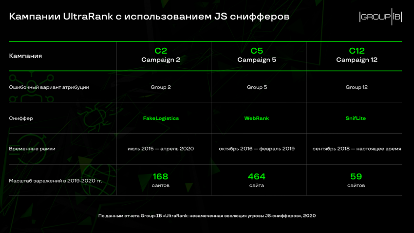Исследователи пишут, что, окончательно вытеснив банковские трояны, группы, использующие JS-снифферы, с конца 2019 года стали основными поставщиками баз текстовых данных банковских карт для продаж на специализированных хакерских форумах. На сегодня JS-снифферы являются одной из наиболее динамично развивающихся угроз. За неполные полтора количество обнаруженных экспертами Group-IB уникальных семейств такой малвари выросло более чем в два раза: сегодня их уже 96.