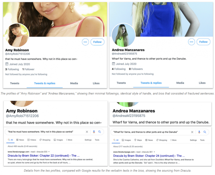 Обнаружить ботнет удалось благодаря весьма экзотической причуде его создателей: подавляющее большинство бот-акаунтов использовало цитаты из «Дракулы» Брэма Стокера для первых двух твитов, а также в качестве описания профиля. Именно поэтому ботнет и получил такое название.
