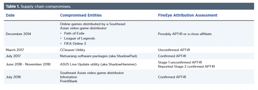 Напомню, что Winnti активна как минимум 2012 года. Хотя впервые операции ATP41 были подробно описаны в отчете компании FireEye, опубликованном в августе 2019 года, но тогда специалисты связали группировку с крупными атаками на цепочку поставок, самые ранние из которых были совершены еще в 2012 году.
