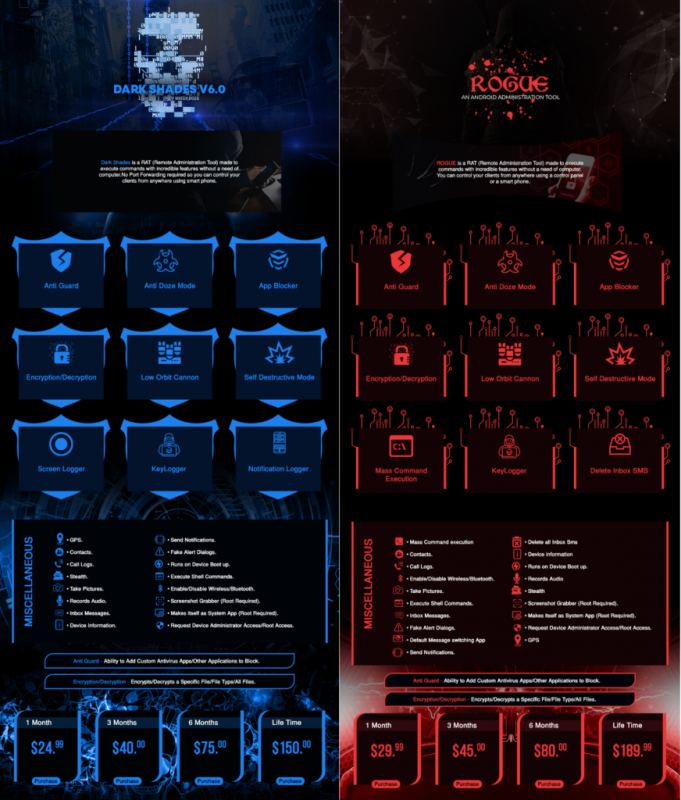 - Rogue: обладает той же функциональностью, что и DarkShades и позволяет отправлять поддельные уведомления, регистрироваться в качестве приложения по умолчанию для обмена сообщениями и получить права администратора устройства.