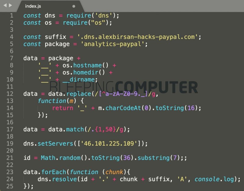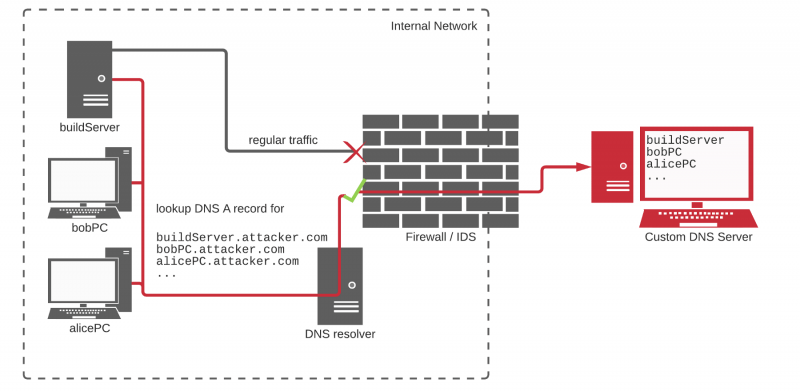Все тестовые пакеты исследователя содержали предустановленные скрипты, которые автоматически запускали скрипт для извлечения идентифицирующей информации с «зараженной» машины, сразу после пула пакетов. Понимая, что его скрипты будут устанавливать соединение из защищенных корпоративных сетей, Бирсан решил обойти механизмы безопасности, использовав DNS для извлечения данных.