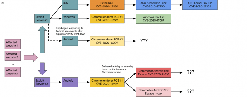 Эксплоит-серверы хакеров использовали цепочки уязвимостей, которые позволяли проникнуть на устройство жертвы, осуществить побег из песочницы браузера, а затем повысить привилегии и закрепиться в системе. При этом злоумышленники не всегда полагались исключительно на 0-day уязвимости, сочетая такие баги с более старыми и известными проблемами, для которых уже существуют патчи.