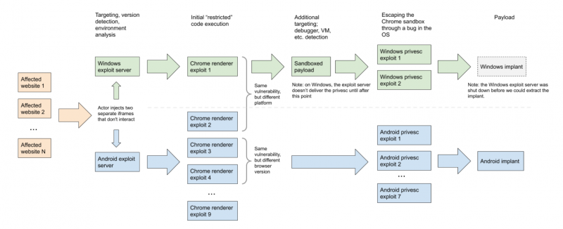 Во всех случаях watering hole сайты перенаправляли посетителей в сложную инфраструктуру злоумышленников, которая использовала различные эксплойты, в зависимости от устройств и браузеров жертв. И если в феврале два сервера хакеров атаковали только устройства под управлением Windows и Android, то в последующих атаках уже были задействованы уязвимости в iOS. Как это работало, показано на схеме ниже.