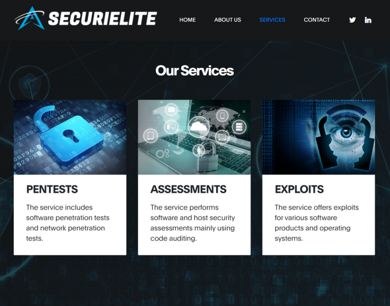 Теперь в Google пишут, что эти атаки возобновились: был обнаружен сайт фейковой ИБ-фирмы SecuriElite, а также ее учетные записи в Twitter и LinkedIn, которые были созданы той же хакерской группой. Якобы фирма находится в Турции и занимается пентестами, оценкой безопасности ПО и эксплоитами.