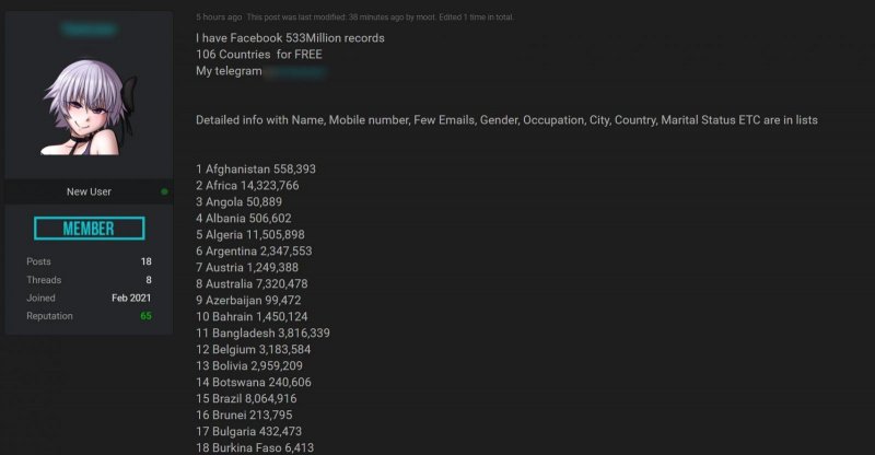В минувшие выходные в даркнете были опубликованы данные 533 313 128 пользователей Facebook. Этот дамп включает в себя номера телефонов, имена, Facebook ID, email-адреса, информацию о местоположении, поле, дате рождения, работе и другие данные, которые могли содержать профили социальной сети.