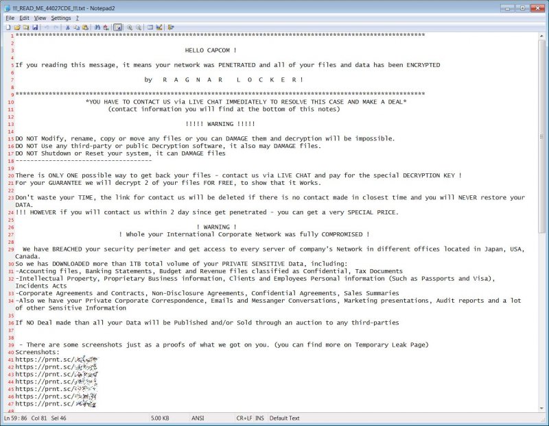 Как выяснилось позже, компания была атакована шифровальщиком Ragnar Locker. В записке с требованием выкупа хакеры писали, что перед началом шифрования они похитили около 1 Тб файлов из корпоративных сетей Capcom в Японии, США и Канаде. Тогда сообщалось, что хакеры потребовали у компании выкуп в размере 11 000 000 долларов.