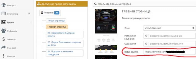 Во-первых, компания вызывает максимальное доверие в вопросе расчетов, во-вторых, здесь самые выгодные условия сотрудничества. Программа брокера имеет название BinPartner, в которой необходимо зарегистрироваться. Остальной процесс не вызывает вообще сложностей – на сайте программы скачиваете ссылку с идентифицирующим кодом. Ниже в скриншоте выделена зона, которую необходимо копировать.