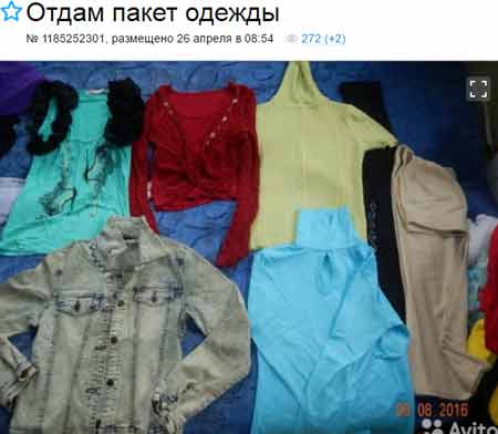 4 этап. Фотографируйте вещи и выставляйте их на Авито либо на Юле. Не забудьте про подробное описание. Цену укажите сами. К примеру, вы забрали этот пакет одежды бесплатно. Вы можете каждую вещь продать за 200 – 500 рублей. Не плохой заработок и абсолютно без вложения денег. потребуется лишь не много времени, чтобы забрать вещи, сфотографировать и выставить на Авито или Юле.