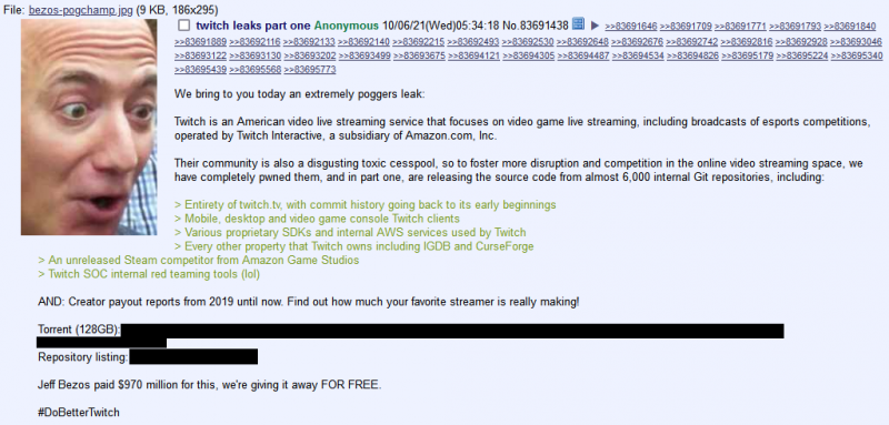 СМИ сообщают, что на 4chan опубликовали ссылку на торрент-файл, содержащий почти 130 Гб данных компании Twitch. Неизвестные хакеры слили в открытый доступ исходный код и бизнес-данные платформы.