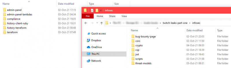 Наиболее конфиденциальные данные, обнаруженные журналистами в дампе, представляли собой папки, содержащие информацию о механизмах идентификации и аутентификации пользователей Twitch, административные средствах управления, а также данные внутренней службы безопасности Twitch, включая модели угроз и фото белой доски, где описываются различные части внутренней инфраструктуры Twitch.