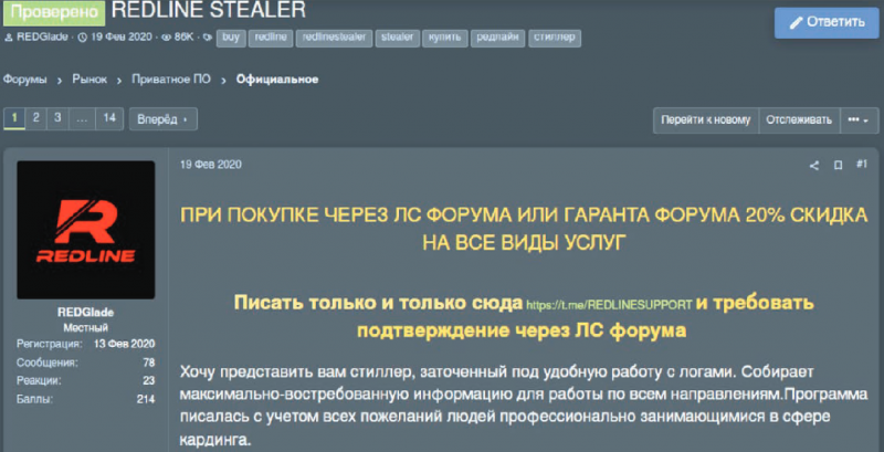 Изначально эта малварь продавалась на хак-форумах под названием REDGlade, но после того как инструмент получил положительные отзывы, на тех же форумах стали появляться пиратские версии RedLine Steale. В итоге, к августу текущего года, это позволило малвари распространиться среди злоумышленников достаточно широко, причем им даже не пришлось платить за использование вредоноса. При этом исследователи отмечают, что и платная версия RedLine Steale тоже нашла своих клиентов.