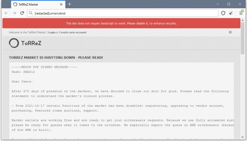 Это сообщение было опубликовано еще 17 декабря, и администраторы ресурса уже отключили регистрацию новых учетных записей и публикацию новых объявлений. Серверы ToRReZ планируется остановить через 2-3 недели, а пока пользователям дали время на вывод средств, завершение транзакций, а также урегулирование любых жалоб и споров.