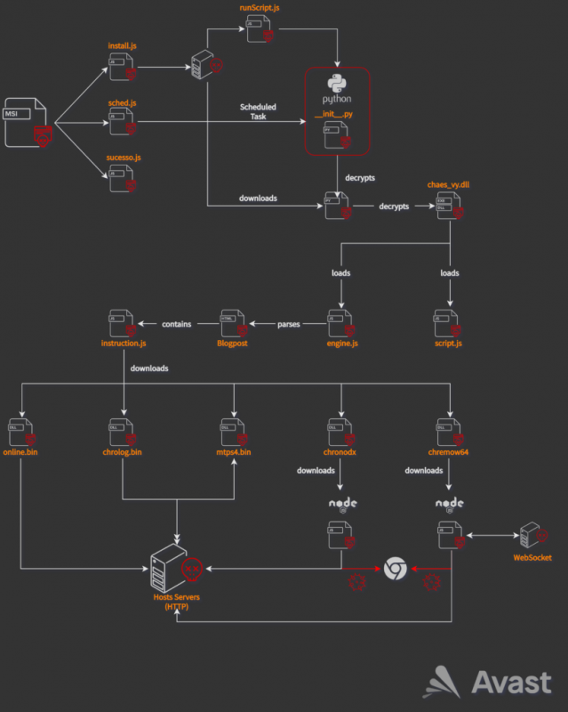 «Для Chaes характерна многоэтапная доставка, в которой задействованы такие среды, как JScript, Python и NodeJS, а также двоичные файлы, написанные на Delphi, и вредоносные расширения для Google Chrome, — говорят исследователи. — Конечная цель Chaes — похитить учетные данные, хранящиеся в Chrome, а также перехватить логины и пароли от популярных в Бразилии банкингов».