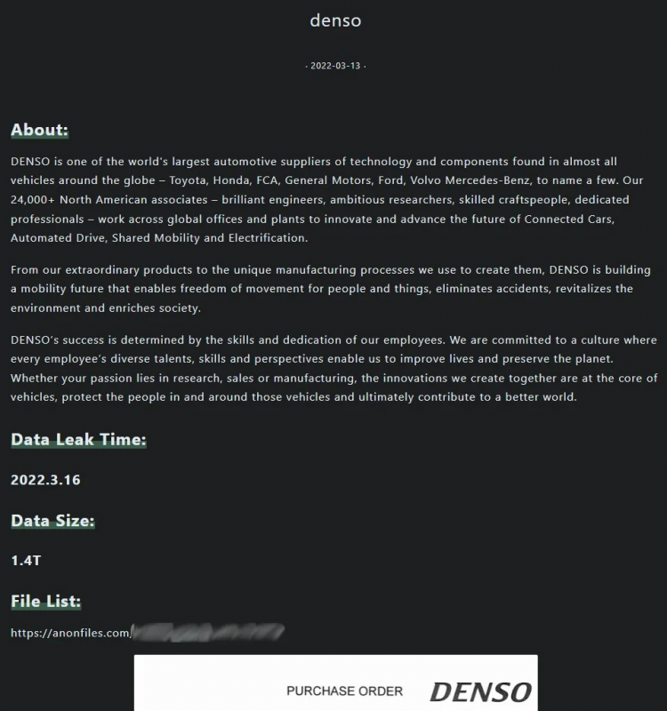 После того как операторы нового шифровальщика Pandora, появившегося на сцене в марте 2022 года, начали сливать данные, представители крупного производителя автозапчастей Denso подтвердили, что компания пострадала от хакерской атаки еще 10 марта 2022 года.