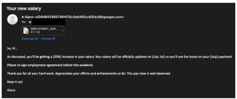 Чтобы обмануть потенциальных жертв и вынудить их открыть документ-приманку, злоумышленники использовали тему повышении зарплаты. Открытие документа приводило к развертыванию скрипта Powershell, который проверял, не является ли система виртуальной машиной, а затем использовался для кражи информации из нескольких браузеров, почтовых клиентов и файловых сервисов, а также для сбора системной информации, после передавая данные на сервер, контролируемый хакерами.