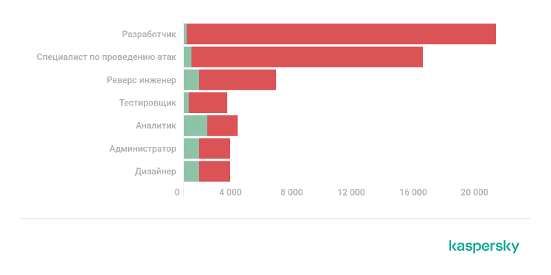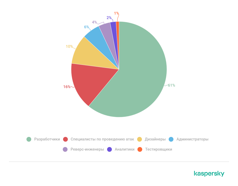 На втором месте находятся специалисты по проведению атак (то есть пентестеры). Доля таких вакансий составляет 17% от общего количества. Большинство вакансий связано с наймом для компрометации инфраструктур организаций (сетевые атаки). Цели взлома могут быть разными: заражение шифровальщиками, похищение данных или кража денег со счетов. Атакующих также нанимают для взлома веб- и мобильных приложений.