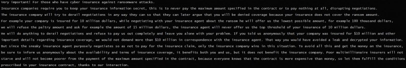 Компаниям, у которых есть страховка от кибератак, хакеры и вовсе представляют подробный набор инструкций и просят сообщить им сумму страхового покрытия для успешного продолжения диалога. Злоумышленники активно создают видимость, что раскрытие информации о страховке выгодно самой жертве, и выставляют страховщиков в невыгодном свете, преподнося все так, будто именно они мешают восстановлению данных.