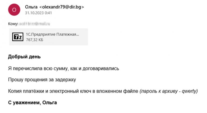 Исследователи рассказывают, что злоумышленники рассылали целям фишинговые письма, замаскированные под уведомления об оплате. К каждому письму прилагался архив, в котором якобы находились накладная «1С:Предприятие» и электронный ключ для доступа к ней. На самом деле внутри архива был файл с расширением .scr.