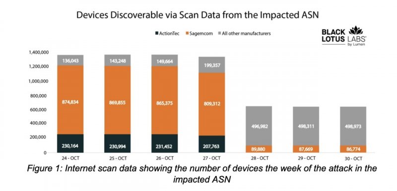 «Лаборатория Black Lotus Labs выявила разрушительный инцидент: более 600 000 SOHO-маршрутизаторов, принадлежащих одному интернет-провайдеру, были выведены из строя. Инцидент длился 72 часа в период с 25 по 27 октября, и привел к окончательному выходу зараженных устройств из строя, потребовав их замены», — рассказывают аналитики в опубликованном теперь отчете.