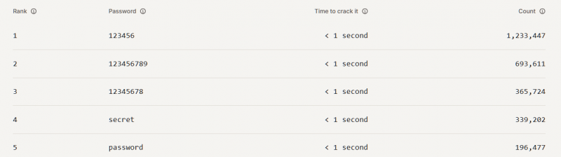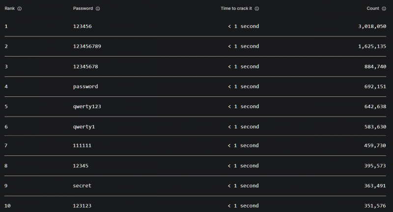 Как можно увидеть в таблице выше, пароль «123456» использовался более 3 млн раз, причем на взлом такого пароля уходит менее секунды. Примерно такими же «надежными» являются и другие пароли, вошедшие в топ-10 («password», «secret», «qwerty123» и так далее).