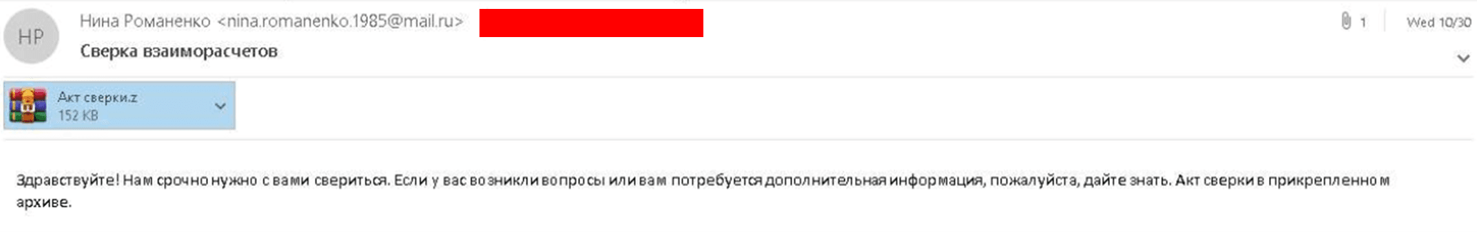 Атака началась с отправки электронного письма, которое содержало грамотный с точки зрения синтаксиса и пунктуации сопроводительный текст на русском языке и архив-приманку.