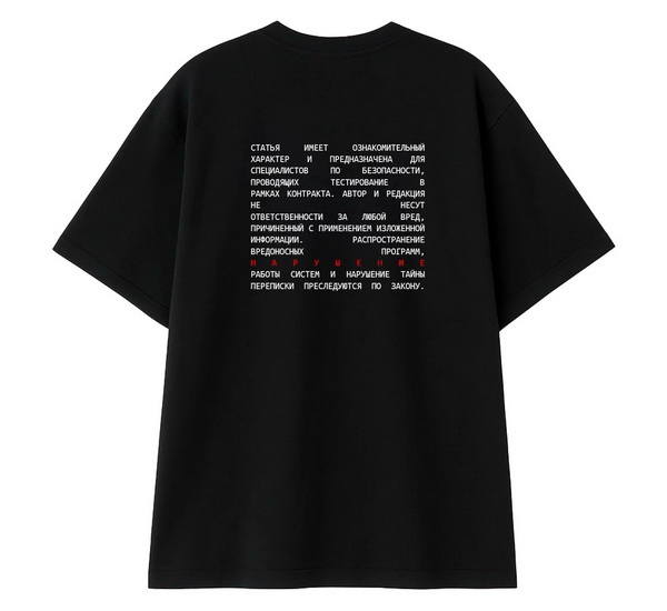 Помнишь дисклеймер, который часто встречается в наших статьях? «Статья имеет ознакомительный характер и предназначена для специалистов по безопасности…» — теперь он есть на футболке, и заказать ее можно прямо сейчас.